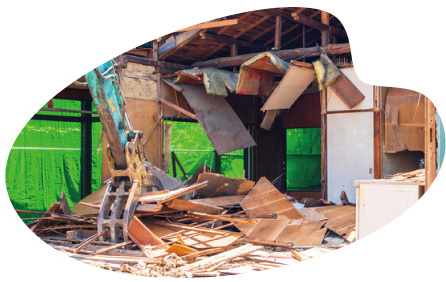 隣家との状況、建物の構造などにより機械での解体作業ができない場合では、手壊しとなります。 振動・騒音・粉塵を軽減し、発生副産物の分別も容易に行えるが、通常解体作業よりも工期がかかります。